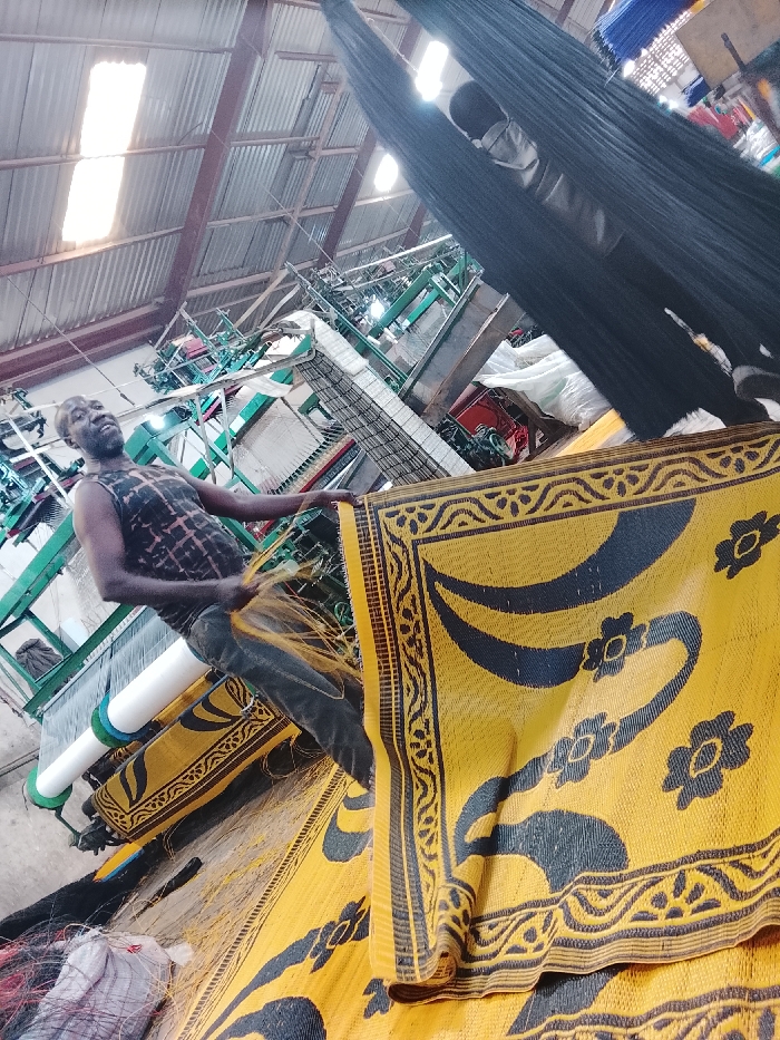 The image depicts an interior scene within an industrial facility in Tudun Wada, Nigeria, likely a mat or textile weaving workshop