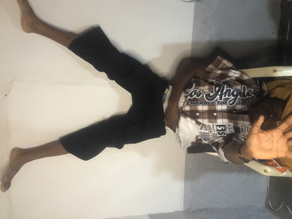 An individual is depicted in an inverted position against a two-toned wall in an indoor setting in Kirana, Nigeria. The person's bare feet and lower legs, clad in black trousers, are extended upwards in a 'V' shape against the white upper section of the wall. Their upper torso, dressed in a brown and white plaid short-sleeved shirt featuring "Los Angeles" text, is supported by or resting adjacent to a light-colored plastic chair. The person's head is positioned near the floor. The left hand is extended forward, palm open towards the viewer. A dark wristband is visible on the left wrist. The lower portion of the wall is painted gray.