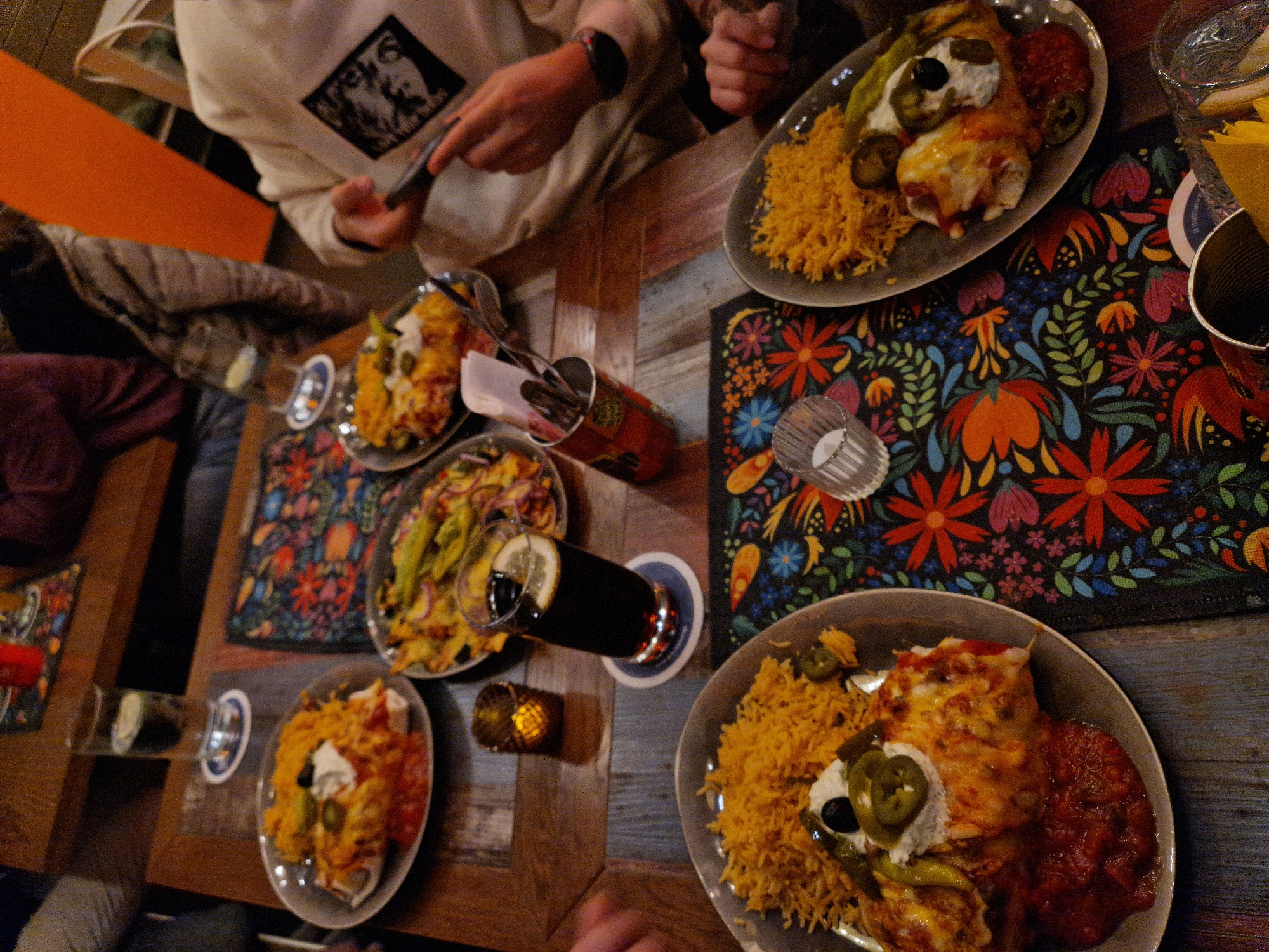 The image depicts an indoor dining scene at a restaurant in Aschaffenburg, Germany, characterized by warm, dim lighting. A rustic wooden table with a distressed panelized surface is prominently featured, covered with colorful placemats displaying elaborate floral and leaf patterns in red, orange, blue, and green hues. Several individuals are gathered around the table, though only partially visible. On the right, a person wearing a white hoodie with a black square graphic is holding a smartphone with both hands, appearing to interact with it or take a photo. Another person's arm is visible on the left side of the table. A third individual in a dark garment is partially visible in the upper left background. The table is laden with multiple dishes of food and beverages. In the foreground, two plates each contain a large, cheese-covered burrito or enchilada, topped with sour cream, sliced green jalapeños, and a black olive, accompanied by a generous portion of yellow rice and a side of red salsa. Towards the center, a tall glass of a dark beverage with a lemon slice rests on a coaster. Adjacent to it is a small, lit tea light candle within a golden, perforated holder. Another plate further up contains what appears to be nachos or a similar dish with melted cheese, sliced green peppers, and red onions. In the upper left, a glass of water with a lime slice is visible on a coaster, next to another plate of food resembling the enchiladas. A red metal container filled with forks and knives stands in the middle of the table. A transparent empty glass is also present. An orange wall is visible in the background on the right.