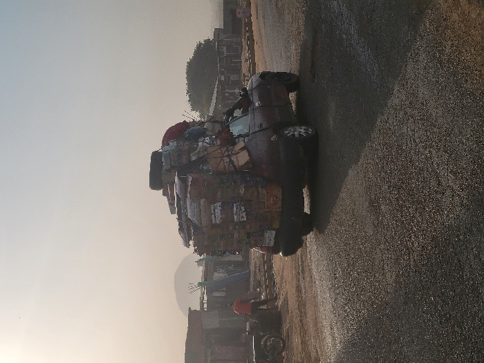 A dark-colored sedan, heavily overloaded with cargo, is positioned on a paved road in Kwamba, Nigeria, observed from a low angle