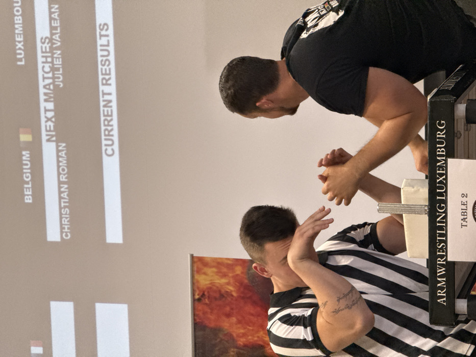 Two men arm wrestle, one in a black shirt, the other in a black and white striped shirt, serving as the referee. The table is labeled "Armwrestling Luxembourg, Table 2". A screen in the background lists "Next Matches" with Belgium's Christian Roman vs. Luxembourg's Julien Valean. A blurred orange and red image hangs on the wall behind the referee. The image is rotated counter-clockwise in the composition.
