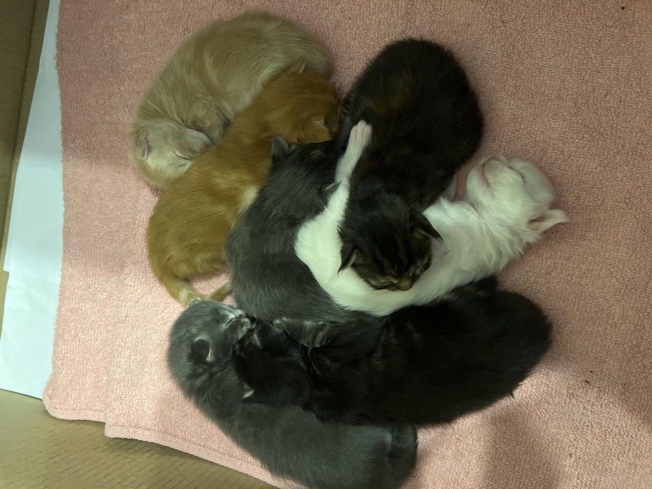 - "Nine very young kittens, characterized by closed or barely open eyes, are observed tightly huddled together, asleep" by FM-Ke9ym1, licensed under CC BY 4.0