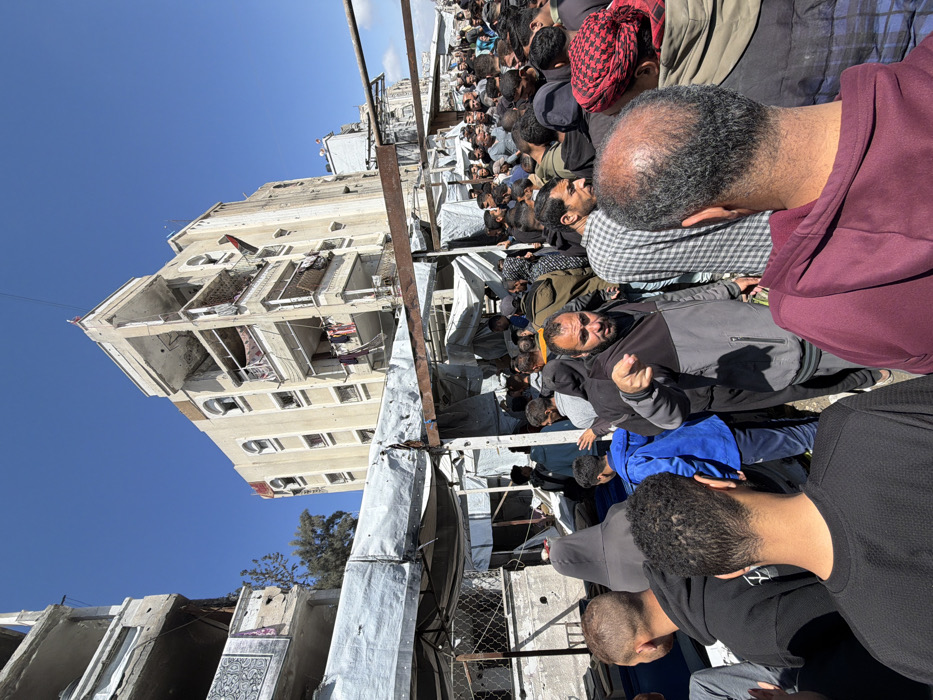 An outdoor scene in Jabalia, Palestinian Territory, depicts a dense crowd of predominantly adult males gathered beneath makeshift shelters, with severely damaged buildings under a clear blue sky