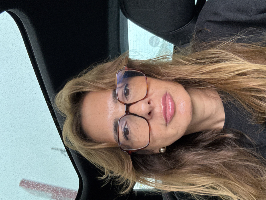 The image captures a female individual, appearing middle-aged, positioned for a headshot within the interior of a vehicle, in the city of Unknown, Unknown