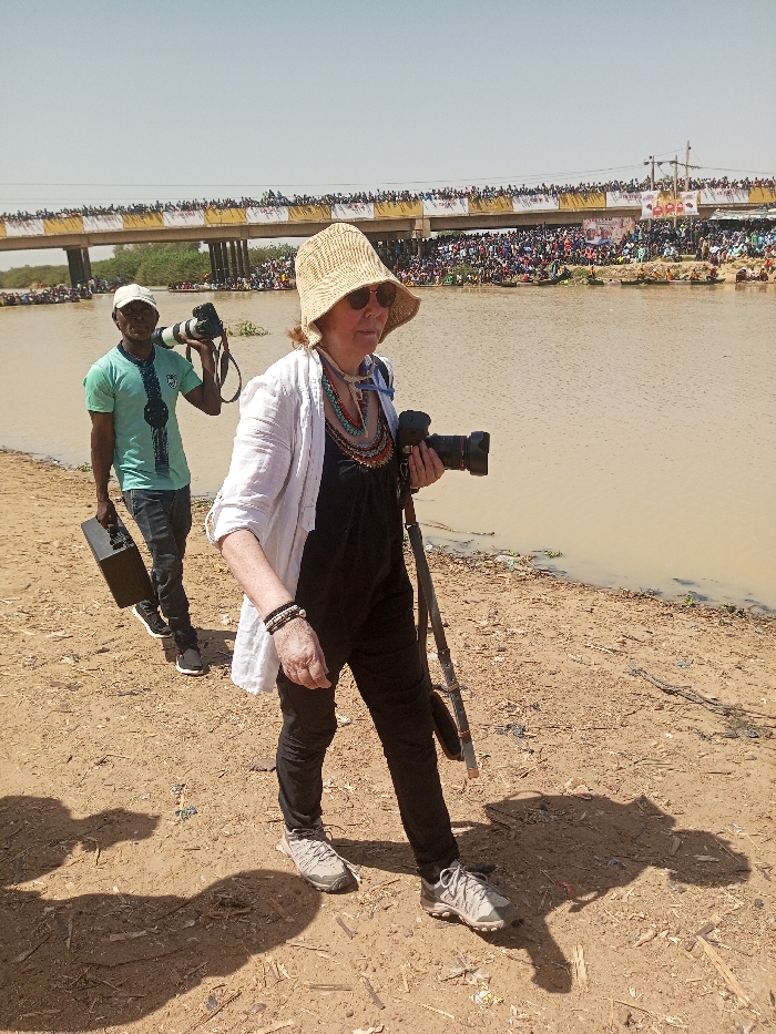 A woman in a straw hat, white shirt, and black jumpsuit walks on a dirt bank carrying a camera and tripod. Behind her, a man in a green shirt and cap holds a camera and a black case. A river separates them from a crowd of people on a bridge and the opposite bank. Some people are in boats on the water. The scene is bathed in bright sunlight, casting distinct shadows.