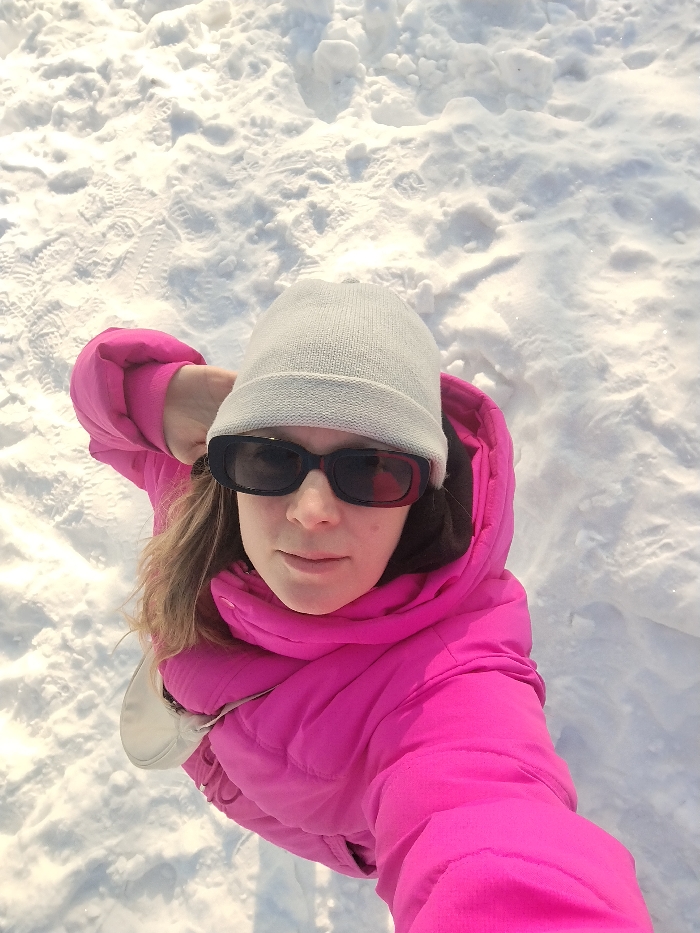 - "A person in a bright pink puffer jacket, grey beanie, and dark sunglasses takes a selfie in the snow" by FM-KQewL2, licensed under CC BY 4.0