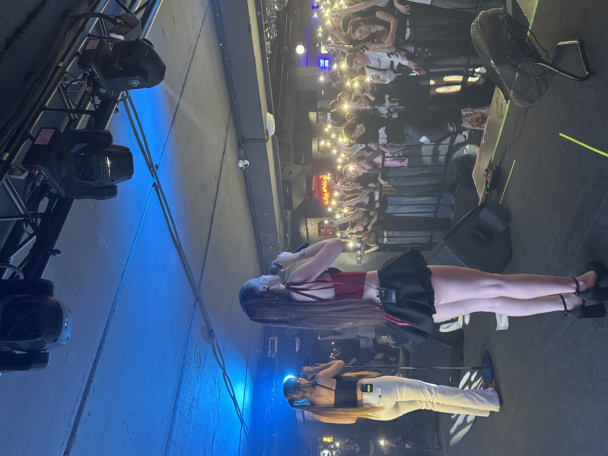 The image captures a live musical performance inside Bar MAWRIN, located in Volgograd, Russia. Two female performers are visible on a dark stage under blue stage lighting. The primary performer, positioned centrally in the foreground with her back mostly to the viewer, has long dark hair and wears a red sleeveless crop top, a black ruffled mini-skirt with red trim, and black platform heels. She holds a black microphone to her mouth, actively singing. An in-ear monitor pack is clipped to her skirt. To her left and slightly behind, a second performer with long brown hair in two ponytails and dark sunglasses wears a black sleeveless crop top and white flared pants, also holding a microphone. An in-ear monitor pack is clipped to her waistband. Behind a metal crowd barrier, an audience of approximately 50-70 individuals faces the stage. A significant portion of the crowd holds up illuminated smartphones, creating a glow effect. On the stage floor, a black floor fan, various cables (including neon yellow ones), and two stage monitors are visible. The venue's ceiling consists of exposed concrete, from which multiple black moving head stage lights are suspended via a truss system. A white security camera is mounted on a ceiling beam. In the background, a red neon sign displays Cyrillic characters, reading "МАВРИН" (MAVRIN), confirming the venue.