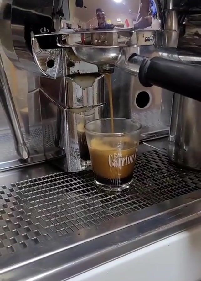 A stainless steel espresso machine is dispensing coffee into a small glass. The glass has “Cafés Carrión” written on the side. The drip tray beneath the glass is stainless steel and has a grid pattern. The coffee flowing into the glass has a dark brown color. A person can be seen reflected in the shiny surface of the machine. The camera remains static during the brief shot.