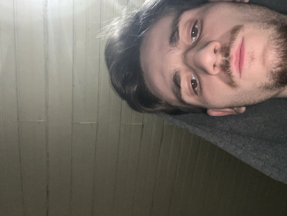 A selfie of a person with brown hair, brown eyes, and a light beard is seen. The person is wearing a grey shirt or blanket. The photo is taken at an angle, with the person's face tilted. The background shows a wall with vertical panels, possibly made of wood, and it is dimly lit. The overall tone of the image is casual and slightly dark.