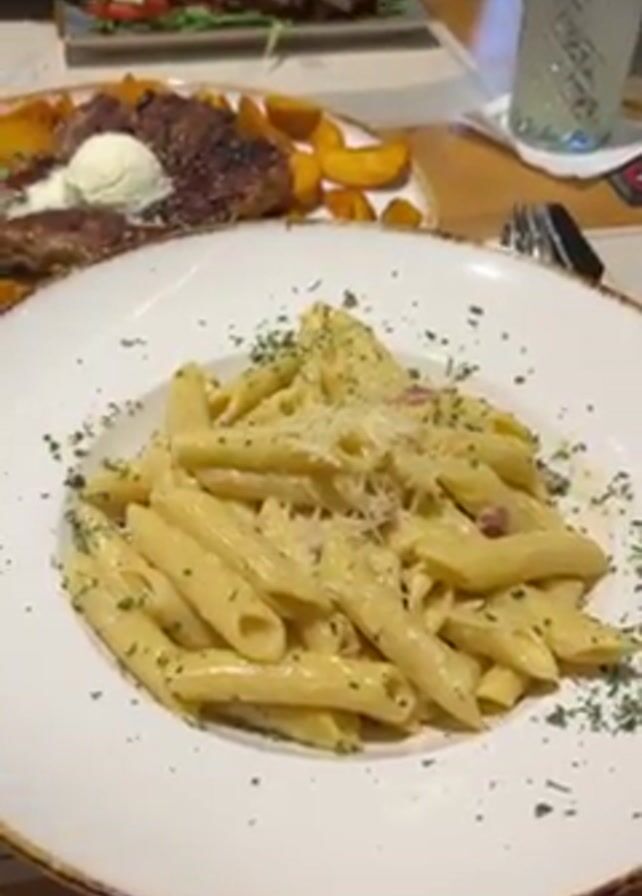 table at a restaurant. A plate of penne pasta with a creamy sauce, bacon bits, and parsley is in focus. Behind it, slightly out of focus, is a plate with a grilled steak topped with a dollop of butter, potato wedges, and a small salad. In the background, someone is eating a salad with a fork, and a glass of clear liquid with ice is visible.