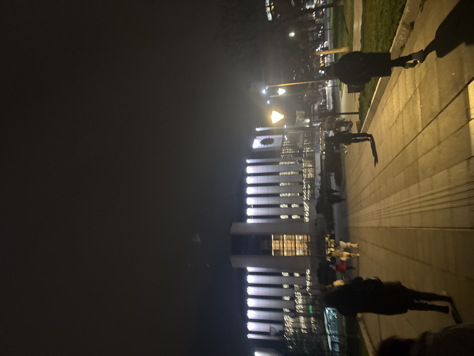 The image displays a nighttime urban scene in Sofia, Bulgaria, centered on the National Palace of Culture (NDK). The NDK building dominates the background, characterized by a brightly illuminated facade with numerous vertical white light strips and a circular emblem visible on its upper right side. The sky is dark and appears overcast. In the foreground and midground, a wide, paved pedestrian walkway extends towards the NDK. The walkway is constructed of large, light-colored rectangular paving stones, and a tactile paving strip runs along its left edge. To the right of the walkway, a grassy park area features several trees, likely deciduous and bare, alongside two prominent streetlights emitting warm yellow light. These streetlights illuminate sections of the path and cast long, distinct shadows from individuals walking. Approximately 10-15 people are visible on the walkway. Most are dressed in dark, possibly winter, clothing and are walking away from the camera, generally towards the NDK. Two individuals are positioned more prominently in the immediate foreground, also walking away from the viewer. One of these individuals, on the far right of the walkway, casts a long shadow to their left due to the streetlight's illumination. Individuals are engaged in transit, with no specific interactions clearly discernible.