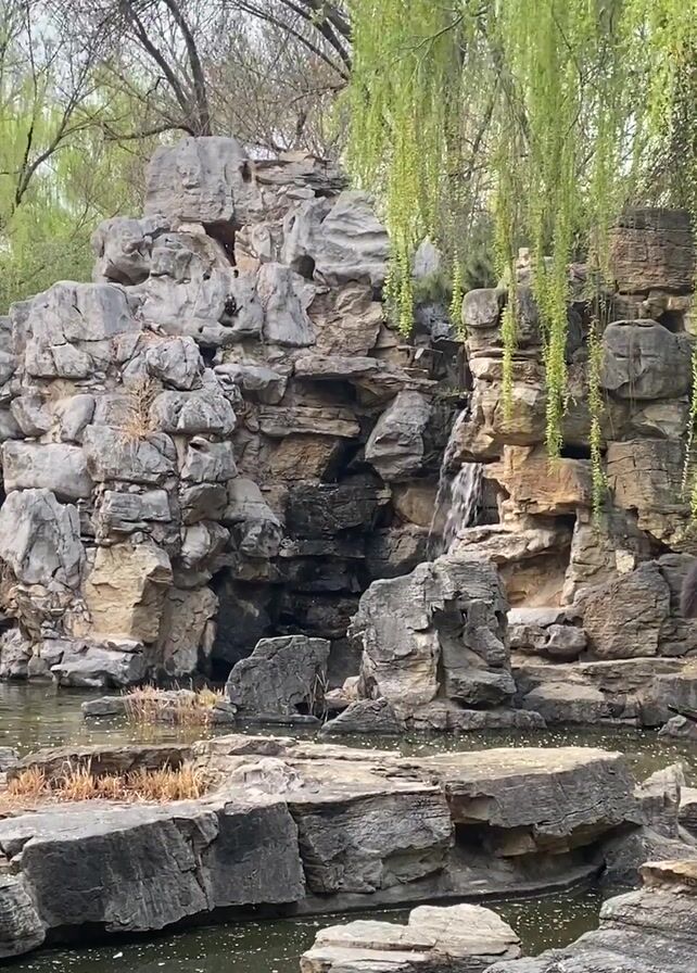 scenic view of a rocky waterfall and pond. A man stands on the rocks near the pond, looking at his phone. The waterfall cascades down a constructed rock formation, surrounded by trees, including weeping willows. The sky is overcast.
