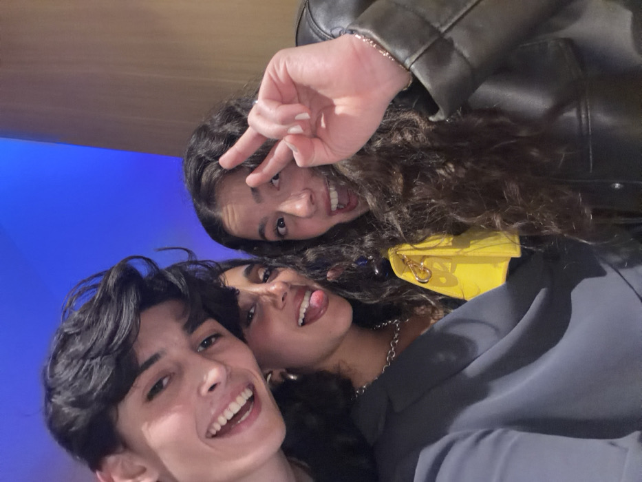 Three young people pose closely for a selfie. A young man with dark hair and a wide smile is in the foreground. Behind him and to the right, a young woman sticks her tongue out. Above her is another young woman smiling and making a peace sign. They are dressed in casual clothes, including a yellow handbag and a leather jacket. The background appears to be a room with blue lighting.