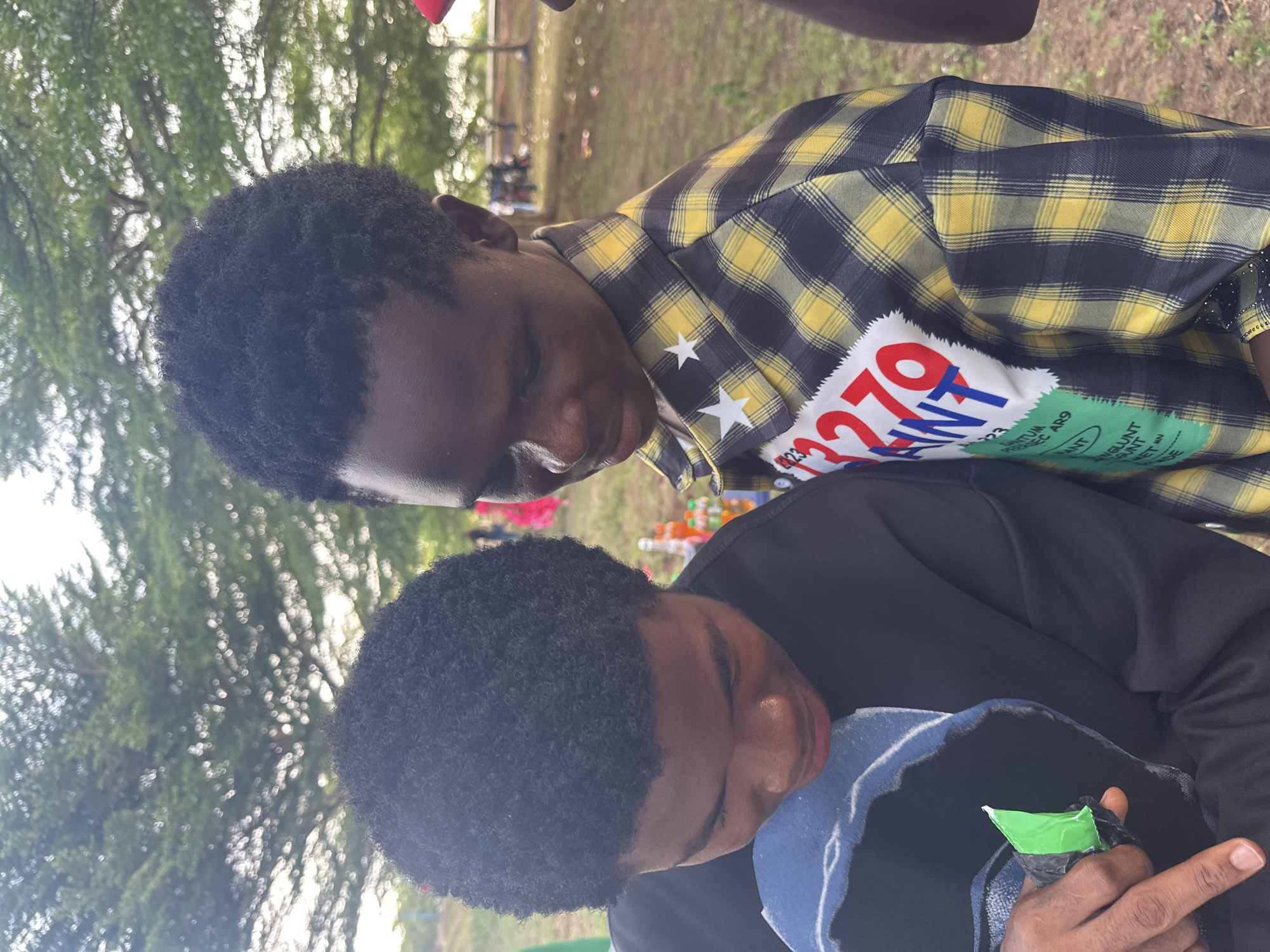 Two people are visible in the image. One is wearing a yellow and black checkered shirt with white stars near the shoulder and a white patch with "279" in red and "NT" in blue. The second person is wearing a black sweatshirt with a blue cloth near their shoulder and is holding a green object wrapped in black plastic in their hand. The photo appears to have been taken outside, potentially in a park-like area with grass and trees visible in the background. There are also some blurred objects, possibly bottles or containers, in the distance. There is no information in this image to indicate a location in the city of Ihiagwa, Nigeria.