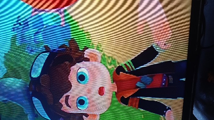 The scene depicts a digital photograph of a screen displaying an animated character