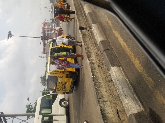 The image depicts a bustling street scene in Obalende, Lagos, Nigeria, during daytime under an overcast sky. The perspective is from a vehicle, with a dark window frame visible in the lower right foreground. In the foreground, a concrete road median separates lanes, consisting of a white and black painted curb and a higher concrete retaining wall. A yellow double solid line is painted on the asphalt road. Central to the midground is a worn yellow commercial minibus (danfo), likely a Volkswagen LT model, with its passenger-side sliding door open. Its rear exhibits visible wear and faded markings. To the left, a modern white commercial minibus is partially visible, facing away from the viewer. Three adult males are positioned around the open door of the yellow minibus. The leftmost male wears a plaid shirt and blue trousers, carrying a red shoulder bag. He faces the middle male, who wears a green t-shirt and dark shorts. The rightmost male wears a white t-shirt and grey shorts, also facing the bus. Their stances suggest interaction, likely related to boarding, alighting, or a transaction common at a bus stop. Further to the right and behind the yellow bus, a woman in a red, yellow, and black patterned traditional dress is visible among other less distinct pedestrians or passengers. A red sedan and another yellow danfo bus are visible in the background, indicating traffic or a queue. The background features a prominent multi-story commercial building with a distinct red roof and white facade. Multiple tall streetlights with integrated solar panels are scattered across the scene, alongside overhead power lines.