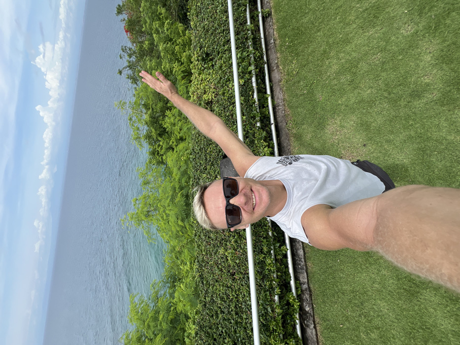 A light-skinned man with blond hair and sunglasses poses for a selfie. He wears a white tank top and smiles. Lush green foliage and a railing separate him from a body of water, possibly the ocean, under a partly cloudy sky. A grassy lawn occupies the upper right of the frame, contrasting with the ocean view. The man's arm is raised, seemingly gesturing towards the scenic backdrop. The image orientation is rotated slightly counterclockwise.