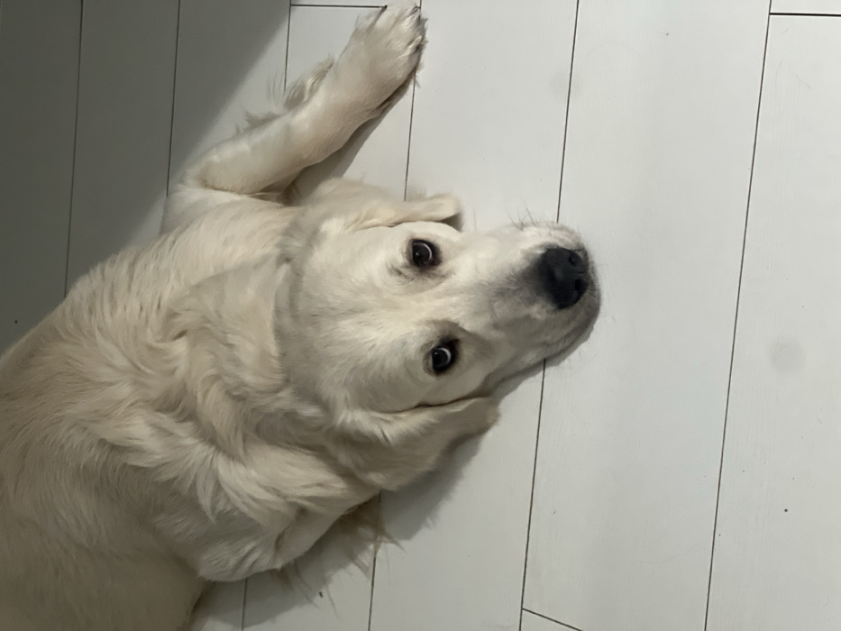 - "A cream-colored Golden Retriever is depicted lying prone on a light-toned, horizontally paneled floor, which appears to be laminate or light wood" by FM-mWrWX2, licensed under CC BY 4.0