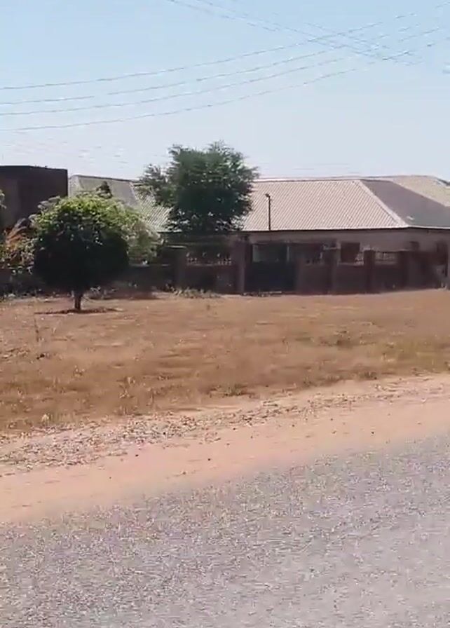slow pan from left to right, revealing a roadside view of an area with houses and vegetation under a clear sky. In the beginning, a large electrical pole stands prominently to the left. Moving to the right, the video showcases buildings with light-colored roofs and a fence. The area in front of the houses is mostly dry grass, with a few small trees dotting the landscape. As the pan continues, more trees come into view, positioned along the edge of the property, before the video ends. The road in the foreground appears to be paved with gray asphalt. The movement suggests the video was taken from a vehicle slowly passing through the area.