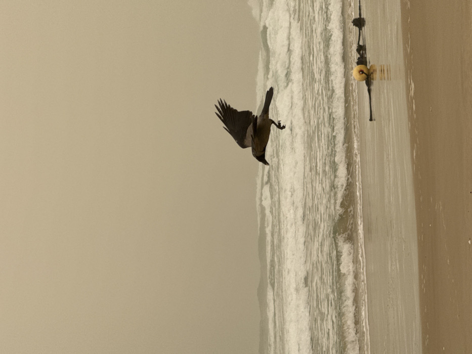 A bird in flight over waves. The bird, possibly a crow, has dark plumage and outstretched wings. It seems to be diving or swooping towards the water. The sea is turbulent with white-crested waves. A yellow object attached to a dark structure is visible on the right. The sky is overcast, creating a muted, atmospheric backdrop. The scene conveys a sense of wildness and natural motion.