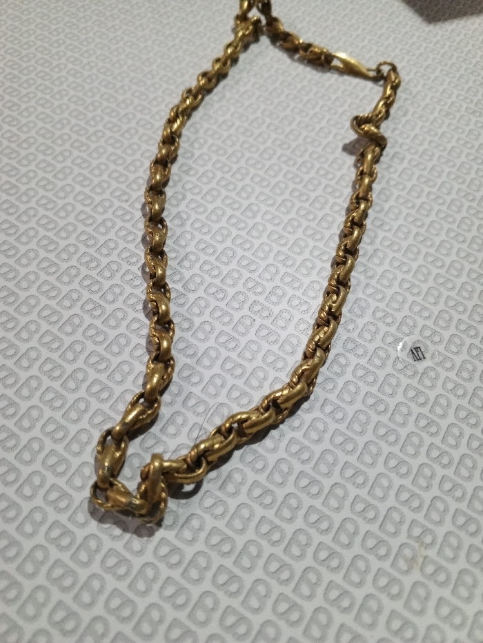 - "A single, gold-colored metallic chain is depicted lying on a light grey-white surface with a repeating, embossed or printed pattern of stylized, interlocking 'B' or 'S' letter shapes" by FM-Eg5TQ2, licensed under CC BY 4.0