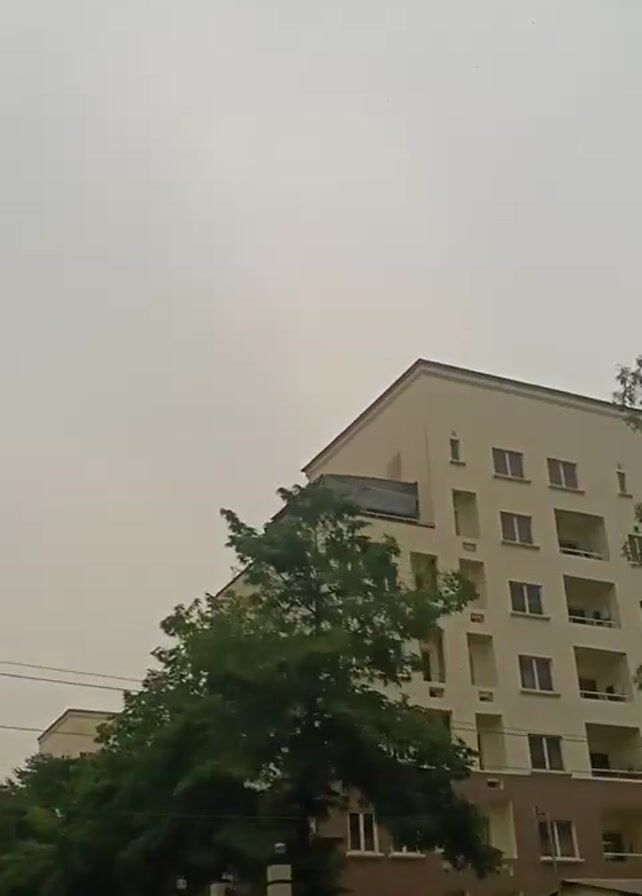 tall building with many windows, partially obscured by trees and power lines. The sky is overcast and gray. There are no visible people. The camera seems to be in motion.
