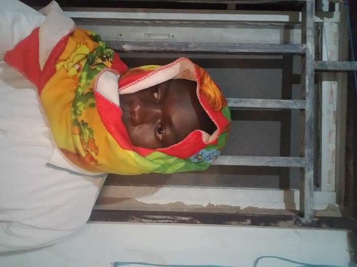 A person with dark skin is lying in bed, possibly sick. Their head is wrapped in a brightly colored towel with yellow, red, and green hues. The bedding appears to be white. A window with multiple horizontal panes is visible in the background, offering a glimpse of what looks like a screen or covered surface beyond. The window frame is weathered and shows signs of wear.