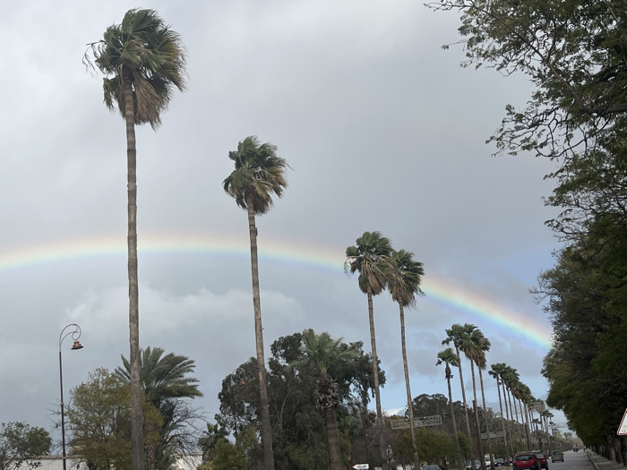 A row of palm trees lines a street under a cloudy sky. A vibrant rainbow arches across the frame, behind the trees. The leaves of the palms are tousled, suggesting a breeze. On the right, thicker, leafy trees provide additional framing. Cars are visible on the street below. A lamppost stands to the left, adding to the urban environment. The overall impression is a beautiful intersection of nature and cityscape.