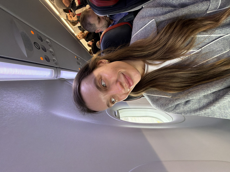 The scene depicts the interior of a commercial passenger aircraft, positioned on the ground at Podgorica Airport (TGD) in Podgorica, Montenegro, as indicated by the airfield visible outside the window. A female passenger is the primary subject in the foreground, seated in a window seat on the port side of the aircraft. She has long, wavy brown hair with lighter highlights, fair skin, and is looking slightly upwards and to her right with a gentle smile. She is wearing a white crew-neck top underneath a ribbed, light gray collared cardigan or jacket with white trim outlining the collar and lapels. A small gold hoop earring is visible in her right ear. Through the elliptical aircraft window to her left, a partial, blurred view of what appears to be an airport tarmac with faint yellow ground markings is visible. Above the passengers, the aircraft ceiling features integrated fluorescent lighting strips and individual passenger service units, which include overhead lights, air vents, and orange indicator lights. In the background, other passengers are seated in rows. Directly behind the primary subject, to her right, a male passenger with dark hair and a beard is visible, looking downwards. Further back in the cabin, another male passenger wearing a light-colored beanie is visible, appearing to be using a mobile phone. A female passenger with dark hair is also visible further down the aisle. The visible seatbacks are red and black. The cabin is well-lit by a combination of natural light filtering through the window and artificial overhead lighting.