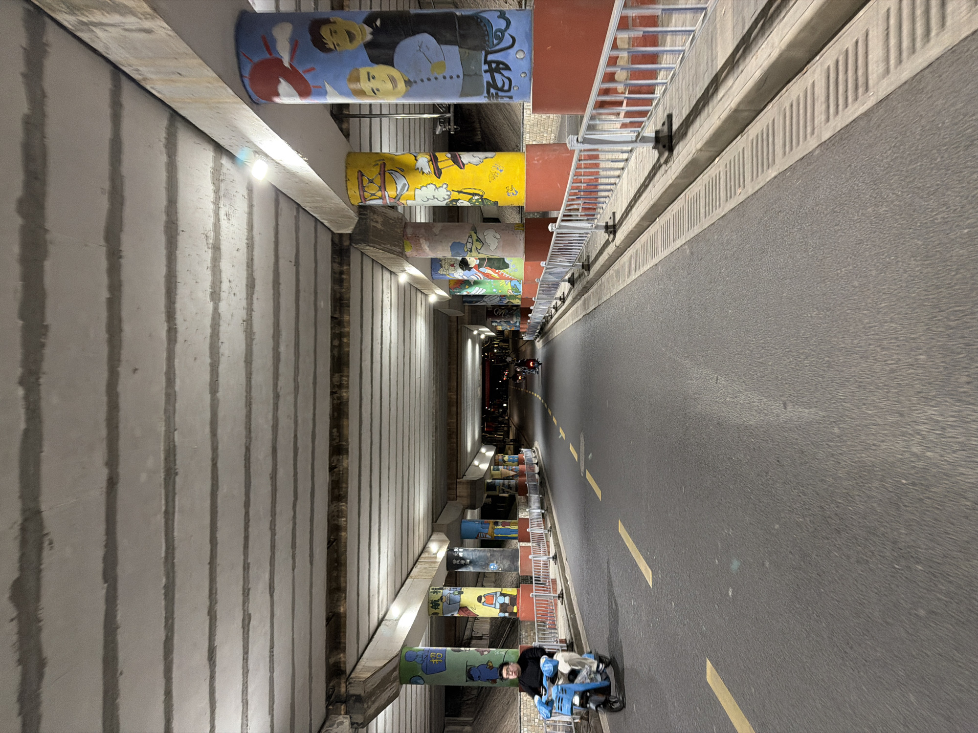 The scene depicts an interior view of a concrete underpass or tunnel at night, located in Jiangning District, China. The underpass features a ribbed concrete ceiling illuminated by multiple artificial lights. A two-lane asphalt road with dashed yellow lane markings runs through the structure. On the right side of the road, a narrow concrete curb with a linear drainage grate separates the roadway from a row of brightly painted concrete support columns. Each column is uniquely decorated with colorful murals depicting cartoon-like figures and Chinese characters, with a uniform red base. A white metal barrier fence with black stands runs along the entire length of the right side, between the roadway and the columns. On the left side of the road, a male individual is operating a blue electric scooter, moving away from the viewer. He wears a dark long-sleeved shirt, light trousers, and glasses, with blue handlebar mitts. Further down the underpass, in the distant background, several other individuals on scooters or motorcycles are also visible, traveling in the same direction.