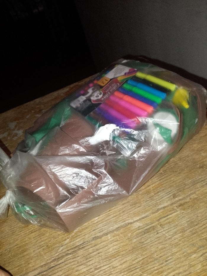 A clear plastic bag containing various craft supplies rests on a light brown wooden surface, displaying a visible grain pattern. The primary contents include a package of "Color Fibre" pens, labeled for 12 units, with visible colors such as pink, purple, blue, green, yellow, and black. Below and around the pens, several brown, block-like objects, possibly modeling clay or similar material, are visible, along with folded green material and a small white cylindrical object. The background is dark and out of focus, indicating an indoor setting with low light. No people or active interactions are present in the image. This scene is reportedly located in the city of Altagracia, Venezuela.