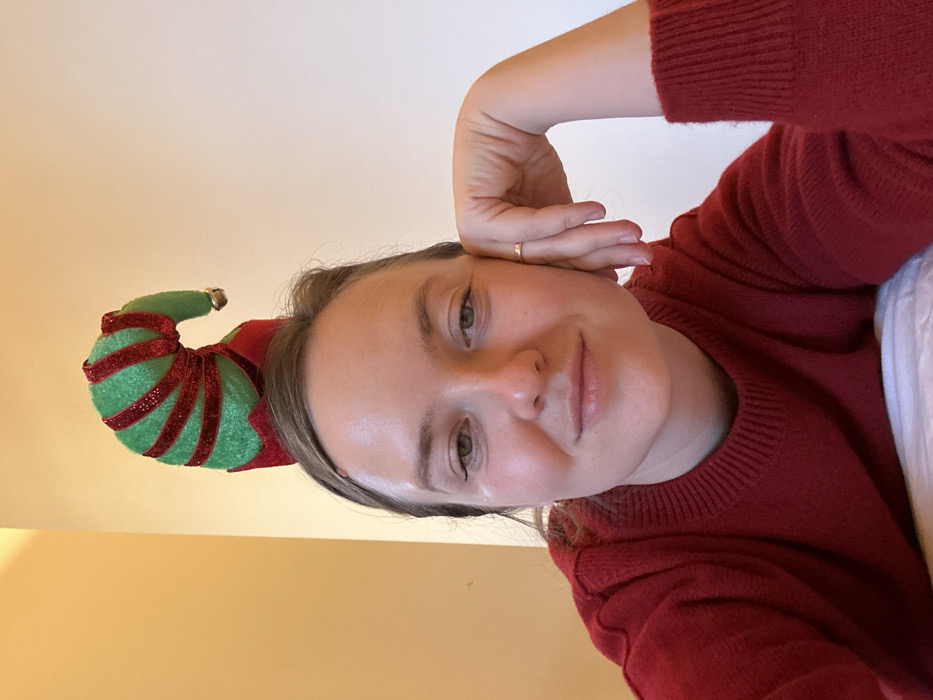 A young woman wearing a red sweater and an elf hat with a green body and red stripes poses for a selfie