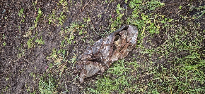 - "The scene depicts a heavily corroded and distorted metallic object resting on damp, dark brown soil interspersed with green grass and small, leafy plants" by FM-Grq9g2, licensed under CC BY 4.0
