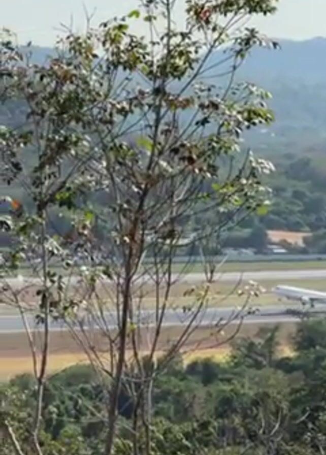white passenger airplane taking off from a runway, with a green, forested landscape in the background. The view is partially obstructed by a tree in the foreground, and the plane initially appears small in the distance before becoming more prominent as it lifts off. An airport control tower is visible in the background near the treeline. The sky is bright and sunny.