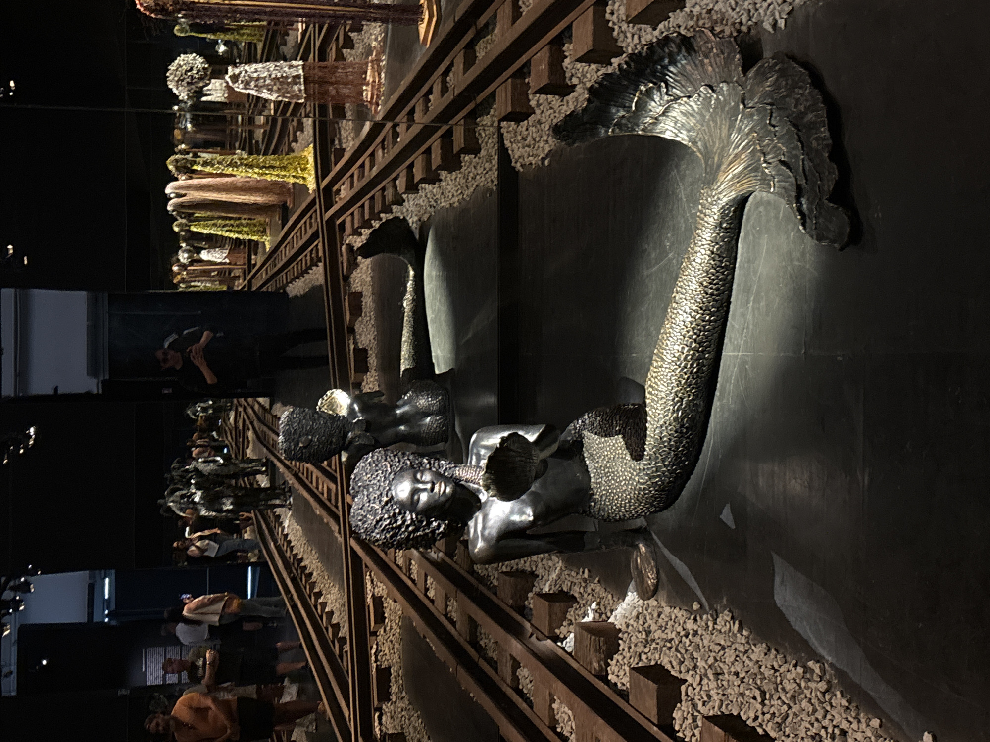 display in the Pinacoteca de São Paulo, Brazil, featuring a series of sculptures arranged along a track that resembles a railway line. The sculptures are of black women, styled as mermaids, lying on their sides. The "track" is set on a bed of small rocks. The background is dark, and there's a reflection in a window, showing people standing in the gallery. The focus is on the sculptures and the "railway" they are placed on.