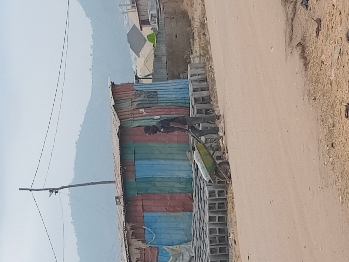 An adult male, with dark skin and dressed in a dark short-sleeved shirt and dark trousers, is observed pushing a green, two-wheeled wheelbarrow containing a light-colored, possibly bagged, material. He is positioned on a light brown, unpaved dirt road in Dam Camp, Nigeria, moving from left to right. To his left, a structure composed of vertically oriented, corrugated metal sheets painted in alternating red, blue, and green sections is present. A stack of grey concrete cinder blocks is arranged in rows extending behind and to the right of the man and the wheelbarrow. A wooden utility pole with overhead wires rises behind the corrugated metal structure. The background features hazy hills or mountains under an overcast sky, with additional structures visible in the distance on the right.