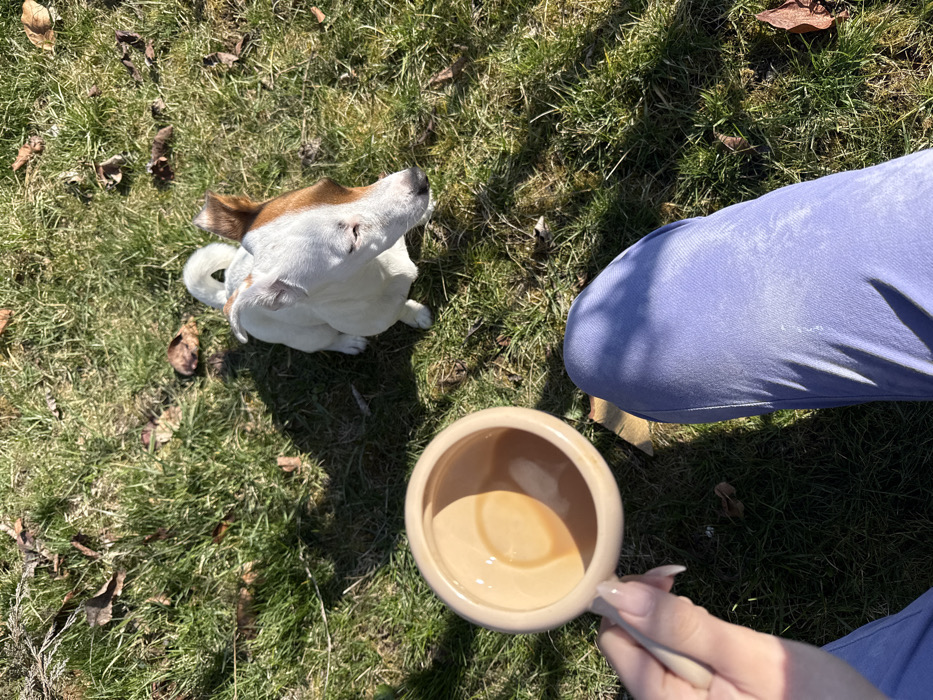 The image captures an outdoor scene in Galabovtsi, Bulgaria, under direct sunlight, indicated by pronounced shadows. The ground consists of green grass with scattered dry brown leaves. A human subject is partially visible, with their left leg, clothed in light blue trousers, positioned in the lower right quadrant. Their left hand, featuring clear or light pink manicured nails, is visible in the lower left quadrant, holding a light tan ceramic mug. The mug contains a light brown liquid, reflecting ambient light from its surface. A small dog, consistent with a Jack Russell Terrier, is situated on the grass in the upper right portion of the frame. The dog has primarily white fur with a prominent brown patch covering its right ear and extending onto its head and back. Its tail is white and curled upward. The dog's gaze is directed towards the human subject and the mug. Its eyes appear partially closed or squinting, consistent with bright outdoor lighting conditions. The dog is positioned attentively towards the human and the object they hold.