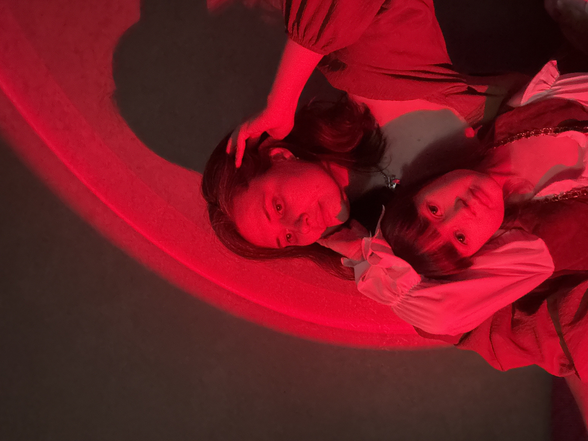 Two young women are lying down in what appears to be a dimly lit room, possibly in the city of Chaikovsky, Russia, though this cannot be confirmed solely from the image. The scene is bathed in an intense red light, which obscures details and creates strong shadows. One woman is closer to the foreground, with her head resting on her hands. The other woman is slightly behind her, also with her head resting. Both are looking towards the camera. The red light casts a curved shape across the floor or surface they are lying on.