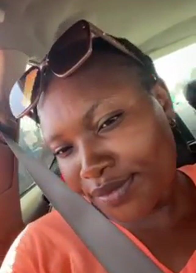 A woman is sitting in a car, wearing sunglasses on her head, an orange V-neck shirt, and a seatbelt. She looks at the camera with a slight smirk. The car seat has red and black accents. Outside the window, it appears the car is moving along a road. The video is taken from a close-up perspective. There is music playing in the background.