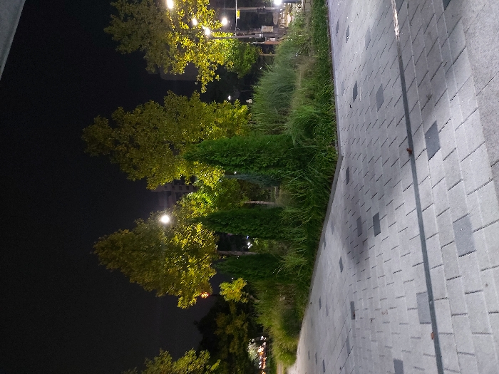 The image displays an illuminated outdoor scene at night in Gimpo-si, South Korea. The foreground features a wide paved walkway constructed from light grey interlocking pavers with darker grey square pavers integrated in a patterned layout. A distinct dark grey linear stripe or channel traverses the pavement horizontally in the mid-ground. To the right, the walkway borders a raised, landscaped planter island. This island is densely populated with several tall deciduous trees, their bright green-yellow foliage illuminated by artificial light sources, and numerous dark green, conical evergreen shrubs. Various grasses and groundcover plants fill the base of the island. In the background, faint outlines of urban structures and additional distant lights are discernible through the dark night sky. No individuals or active subjects are present in the scene.
