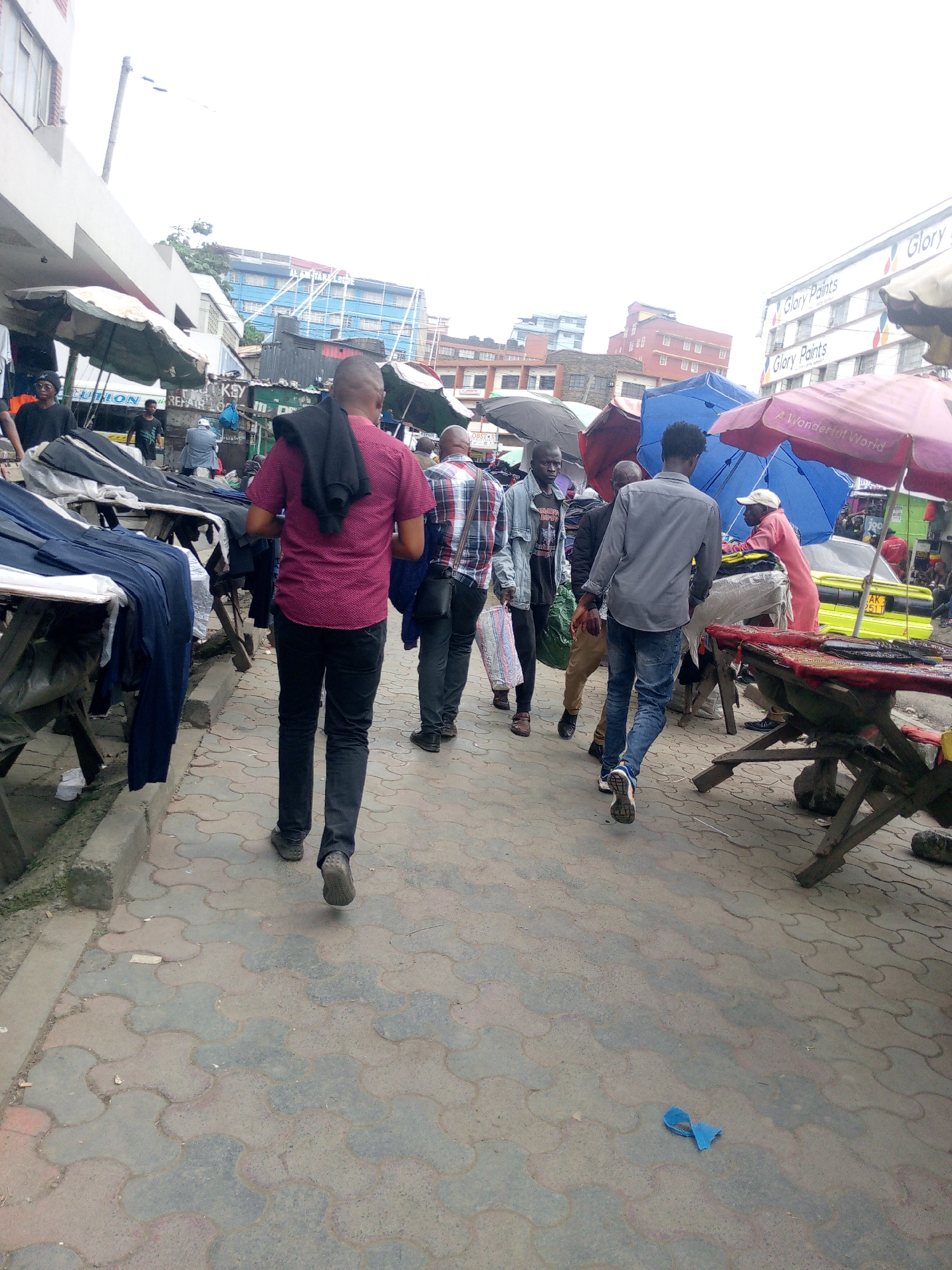 The image captures a bustling street scene in Nairobi, Kenya. The foreground reveals a pedestrian walkway paved with interlocking concrete blocks in a tessellated pattern. Along the walkway, makeshift stalls constructed from wooden supports and surfaces display clothing for sale. Men are walking through the street, some carrying bags and others with jackets slung over their shoulders. Several people are holding umbrellas. In the background, buildings rise, including one adorned with the signage "Glory Paints." A yellow vehicle is also visible, partially obscured by umbrellas. A discarded piece of blue fabric lies on the walkway.
