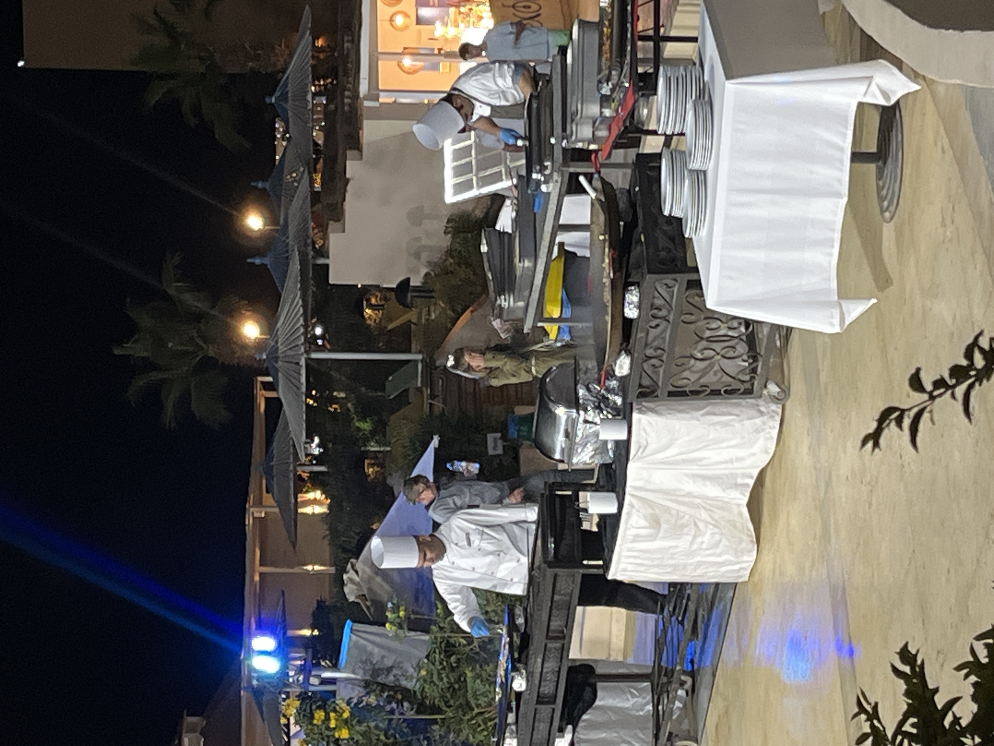 Here is a detailed description of the image: **Location:** Outdoor dining area, presumably in a resort or hotel. The city is unknown. Egypt is in the metadata. **Environment:** It is night time. There is a mix of artificial and natural light. Palm trees and patio umbrellas are visible. The background suggests an upscale resort setting. **People:** There are several people in the frame: - At least two individuals appearing to be chefs, wearing white uniforms and hats. They are likely involved in cooking and serving food. - Other people appear to be guests or staff observing or waiting for service. **Objects:** - Cooking equipment (various pans). - Serving tables draped with white cloths. - Stacks of plates. - Foliage, including plants and trees. - Outdoor lighting fixtures. **Actions:** - Chefs appear to be actively preparing and cooking food. - Guests or staff members are observing the cooking and food preparation. **Interactions:** Chefs are interacting with the food and equipment while other individuals seem to be observing or waiting. The setup indicates an interactive food service experience for guests.