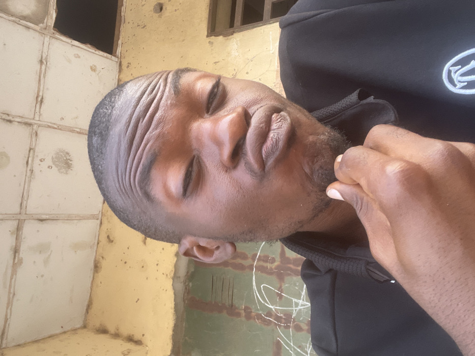 A Black man with a closely shaved head poses for a selfie. He squints at the camera with slightly parted lips. The man wears a black sweatshirt with a white logo on the shoulder. His right hand is near his face. The background is blurry and appears to be an old, weathered building with a window. The image is tilted to the left.