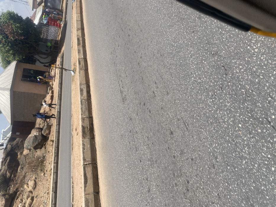 This image displays a daytime street scene in Jos, Nigeria. The foreground consists of a dry, gray asphalt road with visible aggregate and minor surface wear. A raised concrete curb borders the road, separating it from a dirt median, which is then delineated by a second concrete curb. On the far side of the road, along a dusty roadside shoulder, an adult male wearing dark clothing walks away from the viewer, accompanied by a child in light-colored attire positioned slightly ahead and to the left of the adult. Behind them, a small, single-story building with a light-brown exterior and a gray, pyramidal metallic roof functions as a shop, displaying various colorful items near its dark entrance. A green, leafy tree stands beside the shop, casting shadows. Further right, a partially visible stall with stacked red crates is present. Behind the structures, a steep, rocky hillside rises, characterized by numerous large boulders and sparse vegetation. To the left, a dark gate or wall is visible on the hillside. A white pole with a white plastic bag attached is positioned near the roadside, close to the curb. The scene is brightly lit by direct sunlight, indicative of a clear, dry day. The image provides a general view of a street in Jos but lacks specific identifiable landmarks for a precise location within the city. The photograph appears to be taken from inside a vehicle, with a dark vertical frame and a yellow edge visible on the far right.