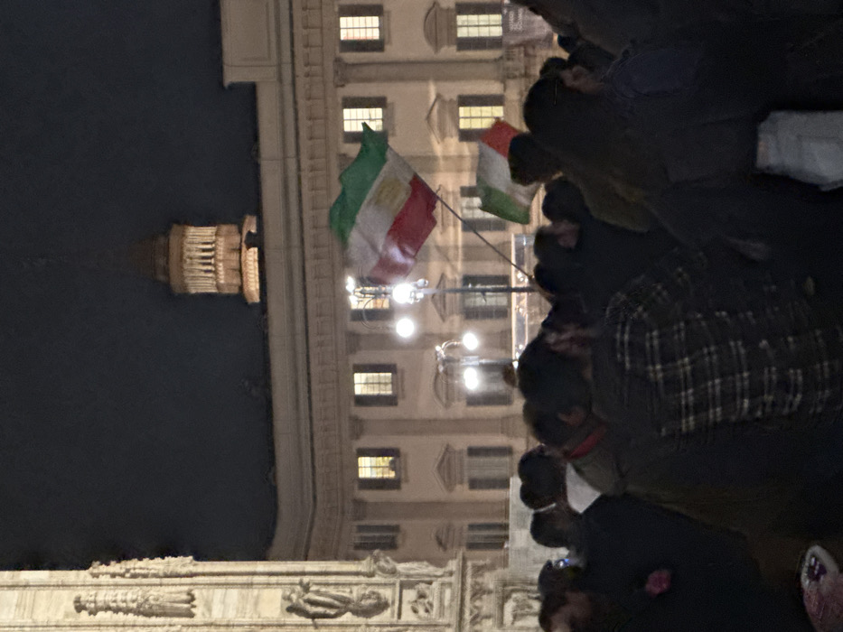 An evening photograph captures a dense crowd gathered in Piazza del Duomo, Milan, Italy. On the left, a portion of the ornate Gothic facade of the Milan Cathedral is visible. In the background, a classical-style building, identifiable as part of the Palazzo Reale complex, stands with multiple illuminated windows and architectural columns. Above and behind this building, a distinct domed structure with a colonnaded drum, likely the cupola of the Chiesa di San Fedele, is visible against the dark sky. In the midground, above the heads of the crowd, two flags are prominently displayed. The upper, larger flag exhibits horizontal green, white, and red stripes, with a central emblem resembling the Lion and Sun, indicative of the historic flag of Iran (pre-1979). Below it, a smaller flag, also displaying green, white, and red vertical stripes, consistent with the flag of Italy, is visible. Several streetlights with bright, circular luminaires illuminate portions of the scene and the flags. The crowd consists of numerous individuals, mostly obscured from the chest up or seen from behind, standing in close proximity. No specific individual actions or interactions are clearly discernible within the crowd. The scene is illuminated by artificial light sources and the ambient glow from surrounding buildings.