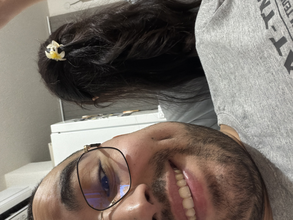 The image captures an indoor scene featuring two individuals. In the foreground, a male subject is partially visible, oriented towards the camera. He wears glasses with gold-colored frames, has a stubble beard, and is smiling, revealing teeth and dimples. He wears a grey t-shirt. Behind him and to the right, a second individual's back is visible. This individual has long, dark, wavy hair styled with a light-colored, flower-shaped hair clip near the crown. They wear a light-colored top. The background elements include a white appliance, likely a refrigerator, and a wall with horizontal paneling. The specific location in the city of Zlatograd, Bulgaria, cannot be independently verified from the visual content of the image.