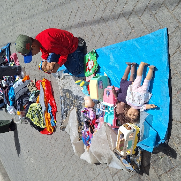 - "A child in a red shirt and blue jeans kneels over a collection of items on a blue tarp laid out on the sidewalk" by FM-b0Aw43, licensed under CC BY 4.0