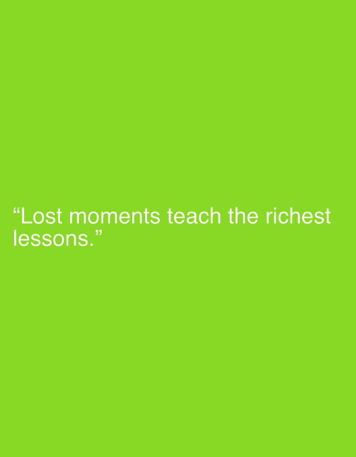 A light green background displays a quote in white. The quote reads, "Lost moments teach the richest lessons." It is positioned in the lower center of the image, with ample green space above. The font is simple and modern, without any distinct serifs or flourishes. The overall composition is clean, emphasizing the quote.