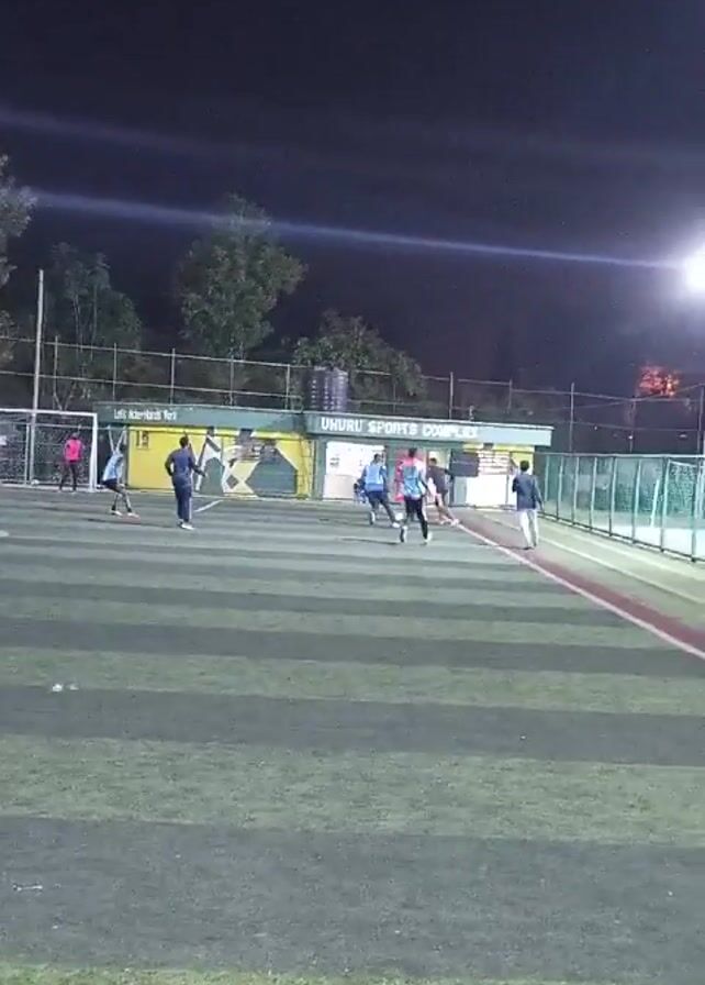 soccer game on an artificial turf field at night, lit by stadium lights. Several players wearing different colored jerseys are actively engaged in the game, running and kicking the ball. One player is near the goal, attempting a shot. In the background, there is a building with the words "UHURU SPORTS CENTRE" written on it. Trees and a fence surround the field.
