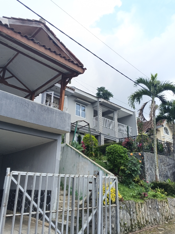 The image displays a residential street scene in the city of Unknown, Cambodia, captured from a low vantage point looking upwards at multiple structures on a sloping terrain under an overcast sky. In the immediate foreground, a light gray metal sliding gate, featuring vertical bars and diagonal bracing, is partially visible. Behind this gate, concrete steps ascend a sloped concrete retaining wall, which shows some discoloration and what appears to be faint graffiti. Above this wall on the left, a multi-peaked, brown-tiled roof structure with exposed wooden beams projects over a garage-like opening. Centered in the midground is a two-story residence, predominantly light gray in color, with a tiled roof. The lower level is partially obscured by the slope but features a green metal swing set or frame in front of it. The upper level includes a prominent balcony with white vertical railings and support columns, and white-framed windows. To the right of this residence, another building is partially visible, characterized by a lighter, possibly cream-colored facade, an arched window, and dark roof tiles. The hillside leading up to these structures is densely covered with various green vegetation, including bushes, smaller plants with red foliage, and larger agave-like plants. A dark gray stone retaining wall, topped with black metal railings, supports the ground for the rightmost building. A tall palm tree with green fronds stands prominently on the right side of the frame, extending into the sky. Overhead, several black utility wires traverse the upper portion of the image against a light blue sky with scattered white clouds. No individuals are present in the scene, and no specific actions or interactions are depicted.